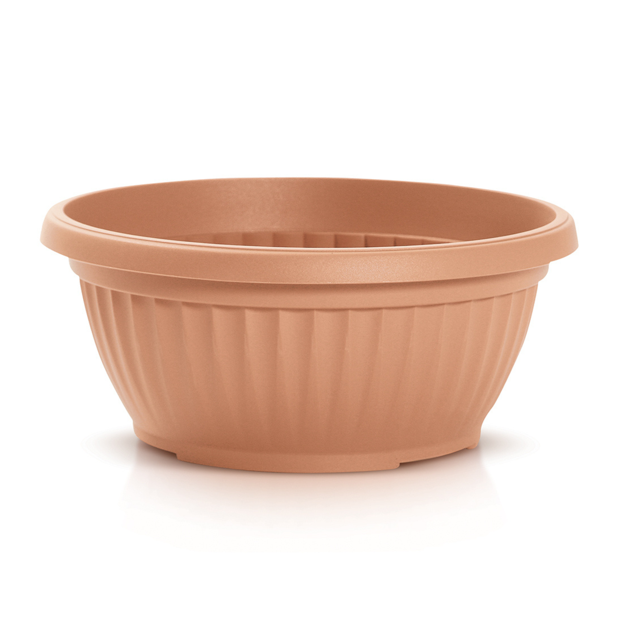 Donica Miska Terra firmy Prosperplast to klasycznie wyglądający produkt z eleganckimi żłobieniami i kołnierzem. Kolor przypomina donicę glinianą, co daje jej ponadczasowy wygląd. Pięknie komponuje się w aranżacjach zewnętrznych jak i pomieszczeniach. Wykonana została z odpornego tworzywa sztucznego.