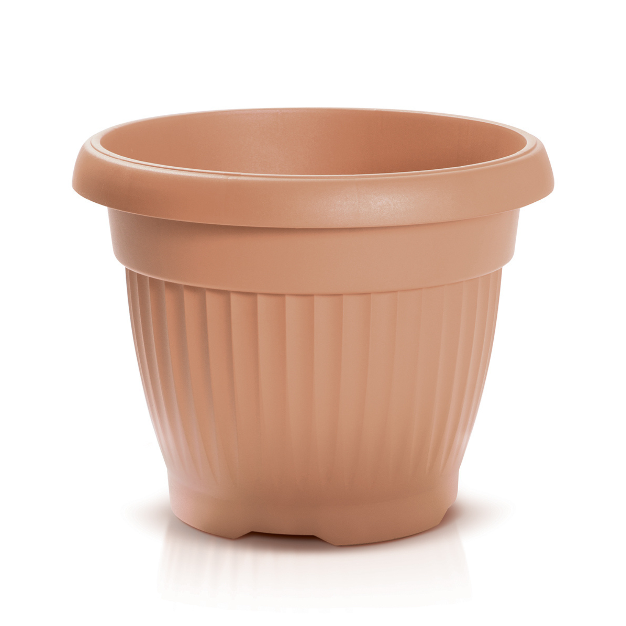 Donica Terra DCE firmy Prosperplast to klasyczny wzór przypominający prawdziwą glinianą donicę. Wykonana jest ona z tworzywa sztucznego, wykończonego rantem i podłużnymi żłobieniami.