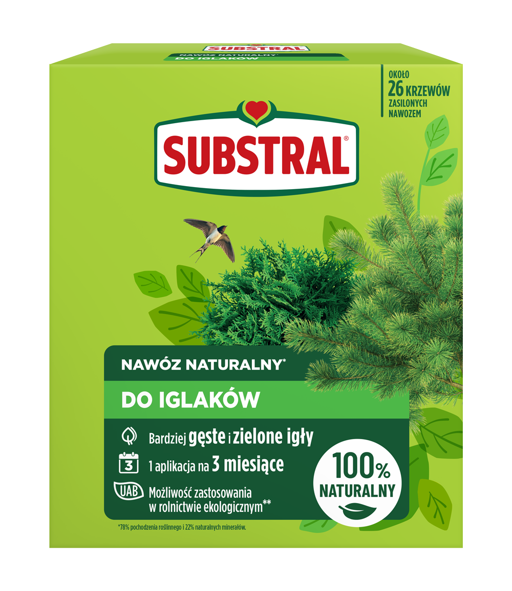 Nawóz naturalny do iglaków 1,2 kg firmy Substral to produkt na bazie składników roślinnych, minerałów oraz zeolitu. Ta wyjątkowa skałka bardzo dobrze utrzymuje wilgoć w glebie oraz zatrzymuje składniki odżywcze, dzięki czemu nie uciekają one w głąb ziemi i roślina może z nich korzystać. Nawóz ten nada się idealnie do wszystkich odmian drzew i krzewów iglastych, zapewniając intensywne wybarwienie oraz lepszą odporność na choroby. Działa aż do 3 miesięcy, co zaoszczędza czas oraz pieniądze. Ten produkt nie zawiera substancji pochodzenia zwierzęcego, a jego opakowanie wykonane jest z recyklingu.
