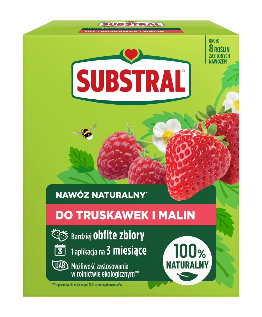 Nawóz naturalny do truskawek 650 g firmy Substral to produkt na bazie składników roślinnych, minerałów oraz zeolitu. Ta wyjątkowa skałka bardzo dobrze utrzymuje wilgoć w glebie oraz zatrzymuje składniki odżywcze, dzięki czemu nie uciekają one w głąb ziemi i roślina może z nich korzystać. Nawóz ten nada się idealnie do truskawek oraz innych krzewów jagodowych, zapewniają bardzo obfite owocowanie. Działa aż do 3 miesięcy, co zaoszczędza czas oraz pieniądze. Ten produkt nie zawiera substancji pochodzenia zwierzęcego, a jego opakowanie wykonane jest z recyklingu.