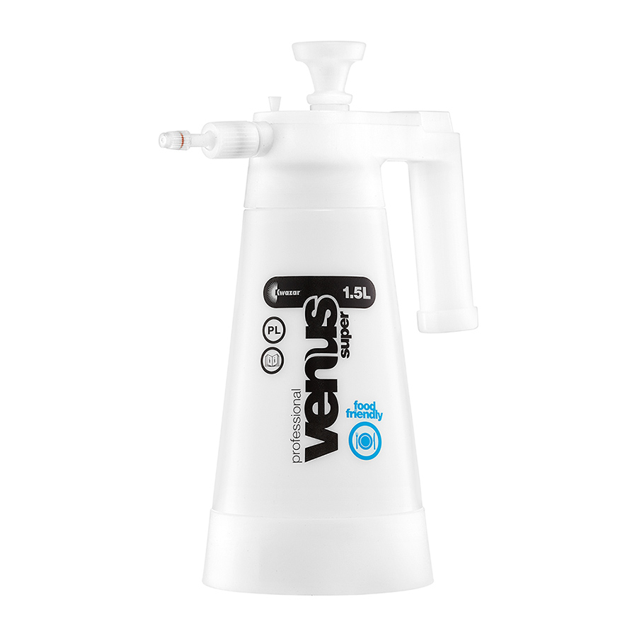 Opryskiwacz ręczny Venus Super Food firmy Kwazar o pojemności 1,5 l jest przeznaczony do aplikacji jednorodnych, płynnych artykułów spożywczych, np. woda pitna, ocet, alkohole, oleje spożywcze, mleko. Idealnie sprawdzi się w hotelarstwie, restauracjach, cukiernictwie czy piekarstwie. Opryskiwacz wyposażony jest w uszczelnienia z materiału VMQ. Spełnia również wymogi określone dla wyrobów z tworzyw sztucznych, mających kontakt z żywnością w następujących rozporządzeniach:
